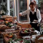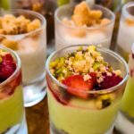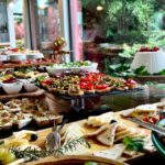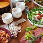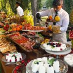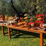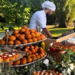 E poi buffet degli antipasti con fritti vegetali espressi, degustazione di formaggi e salumi locali, accompagnati da gelatine di vino. Fantasia di bruschette, verdure grigliate, caponatina o panzanella fresca, bicchierini di caprese destrutturata o con crumble di verdure, l’angolo del mare, polpettine al curry, mini supplì e crocchette fatte in casa e tanto altro.
